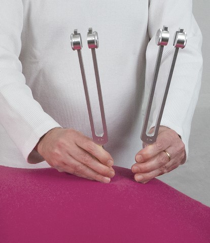 Les sons des diapasons peuvent être soit transmis directement sur le corps soit émis vers les oreilles.